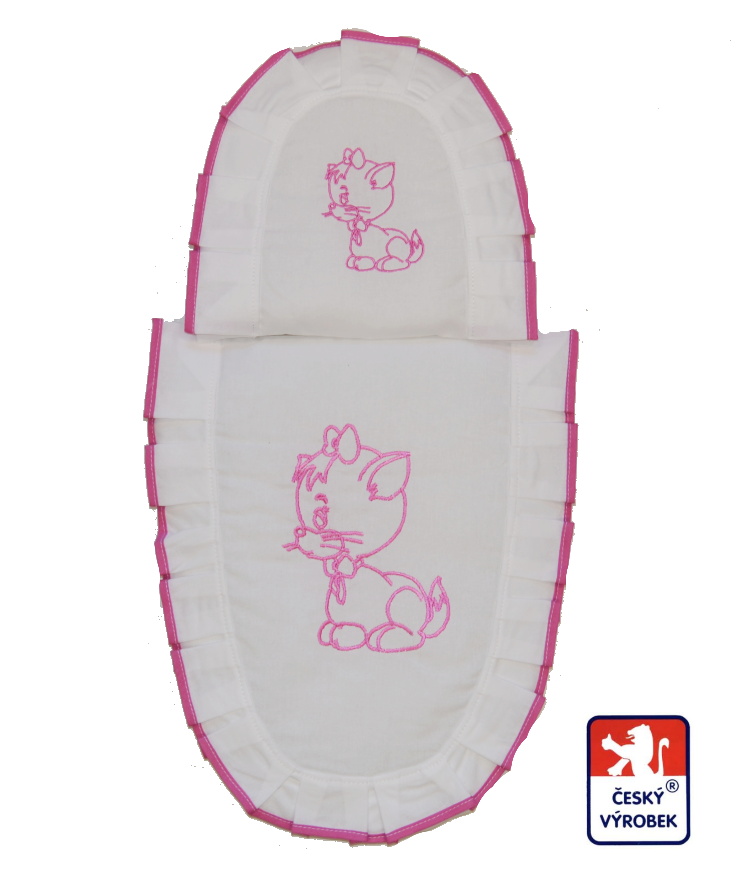 - Peřinky na kočárek pro panenky, Dětský svět, bílé, lemované s růžovou kočičkou