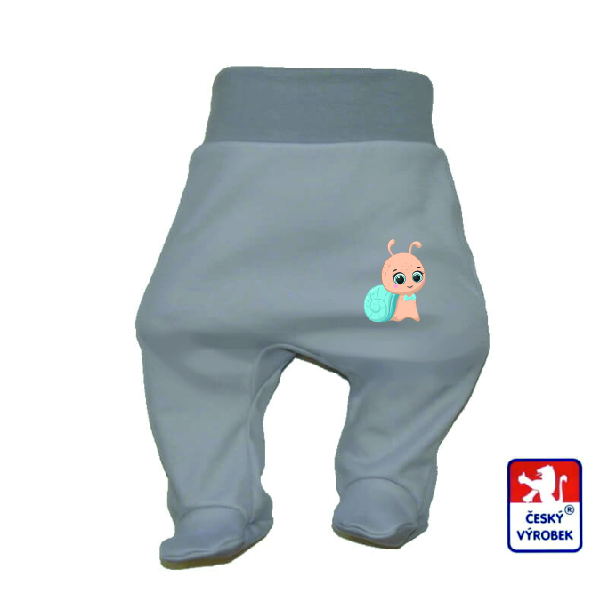 Polodupačky pro miminko, Dětský svět, světle šedé s obrázkem tyrkysového šnečka, jsou vhodné pro miminka již od narození. Jemná, hladká, atestovaná dětská 100% bavlna je velmi příjemná a nedráždí pokožku dítěte. Kojenecké/dětské polodupačky pro miminko, jsou vyráběny v nejvyšší možné kvalitě.