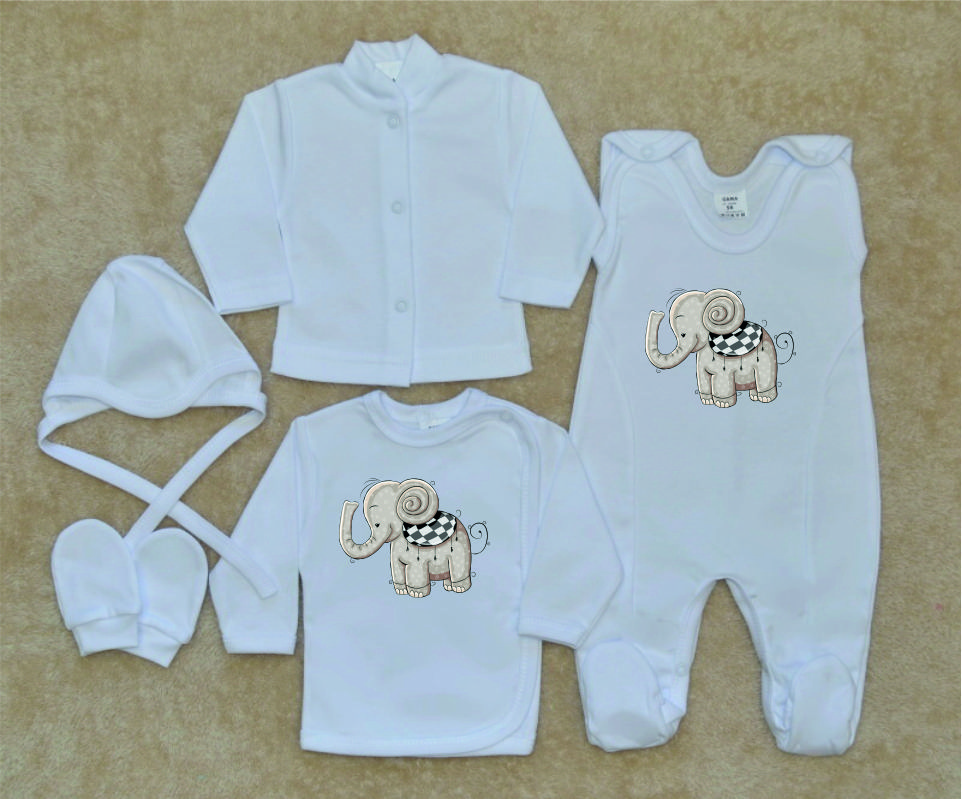 Sada oblečení pro novorozence , Gama, slon je nádherná, vysoce kvalitní, svým potiskem decentní, 5-dílná kojenecká soupravička pro miminko, která je vyrobená ze 100% velmi jemné, kojenecké, velmi příjemné, atestované bavlny, vhodné pro miminka.