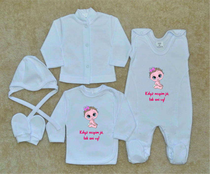 Bílá kojenecká soupravička pro miminko do porodnice, Gama, Když nespím já, tak ani vy, holčičí, je vysoce kvalitní, svým potiskem decentní, 5-dílná kojenecká soupravička pro miminko, která je vyrobená ze 100% velmi jemné, kojenecké, velmi příjemné, atestované bavlny, vhodné pro miminka.