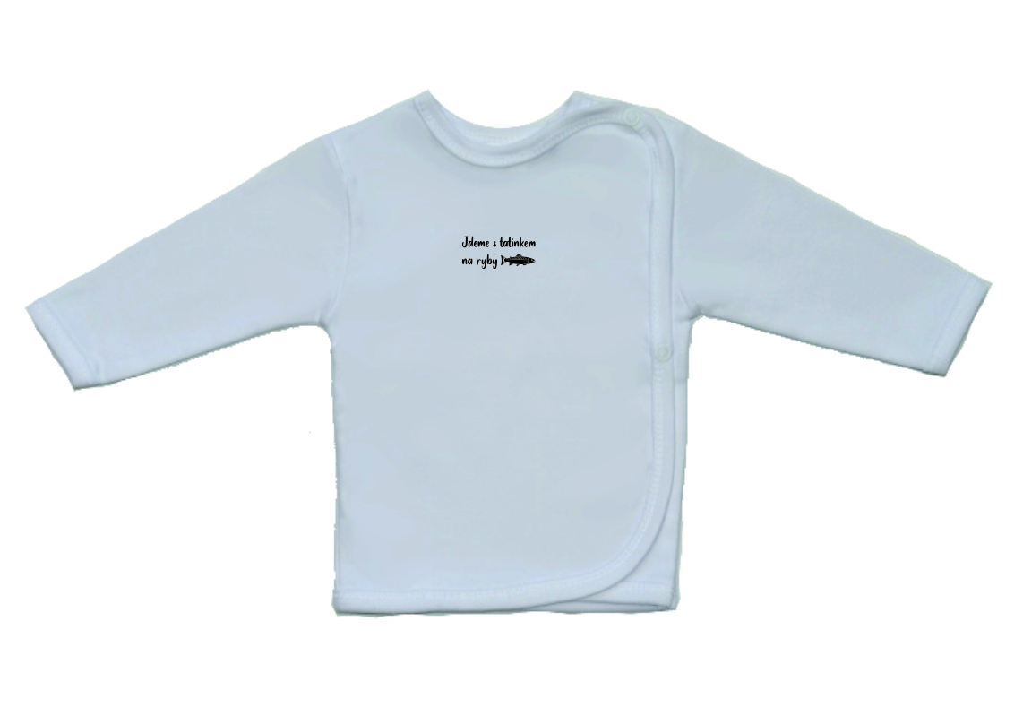 Kojenecká košilka Gama bílá s vtipným potiskem, jdeme s tatínkem na ryby, v menším provedení, je krásná a velmi kvalitní košilka pro miminko, zdobená menším vtipným nápisem. Boční zapínání na cvočky po celé délce usnadňuje oblékání košilky miminku.
