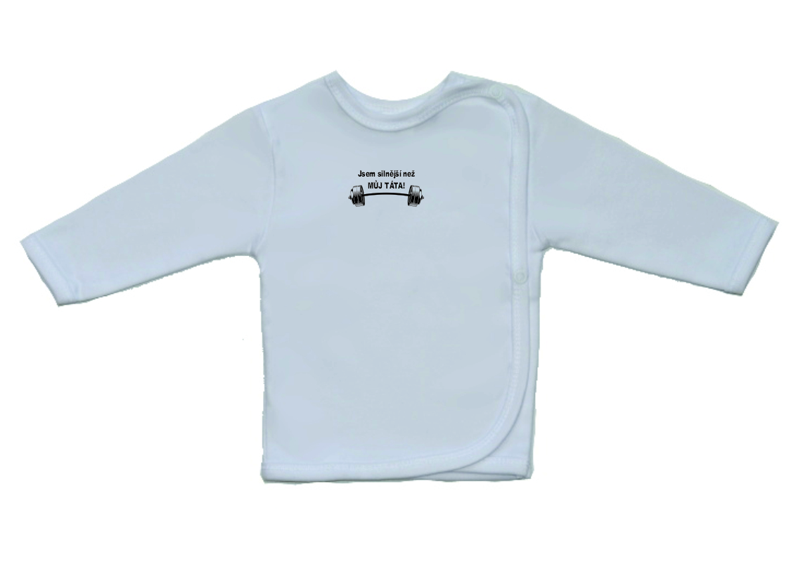 Kojenecká košilka Gama bílá s vtipným potiskem, jsem silnější než můj táta, v menším provedení, je krásná a velmi kvalitní košilka pro miminko, zdobená menším vtipným nápisem. Boční zapínání na cvočky po celé délce usnadňuje oblékání košilky miminku.