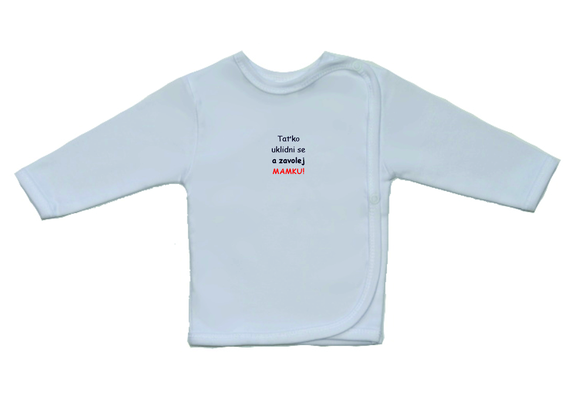 Kojenecká košilka Gama bílá s vtipným potiskem, taťko uklidni se a zavolej mamku, v menším provedení, je krásná a velmi kvalitní košilka pro miminko, zdobená menším vtipným nápisem. Boční zapínání na cvočky po celé délce usnadňuje oblékání košilky miminku.