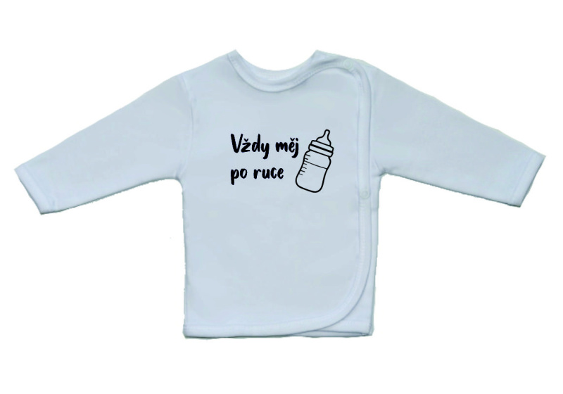 Vtipná kojenecká košilka, Gama, bílá s větším nápisem Vždy měj po ruce mléko, je krásná a velmi kvalitní košilka pro miminko, zdobená vtipným textem ve větším formátu. Boční zapínání na cvočky po celé délce usnadňuje oblékání košilky miminku.