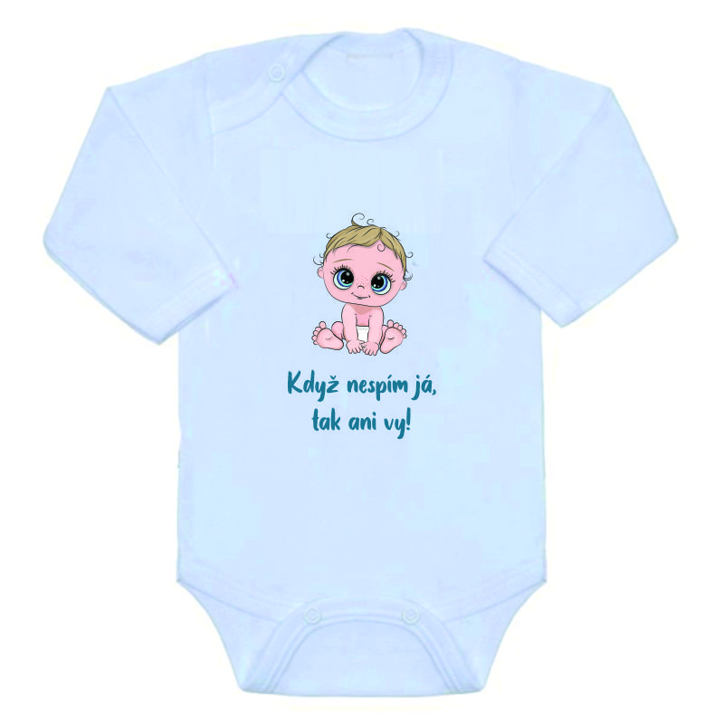 Vtipné body pro miminka, Když nespím já, tak ani Vy! je vysoce kvalitní, bavlněné dětské body s dlouhým rukávem v bílé barvě s potiskem obrázku a českého textu ve velkém provedení.