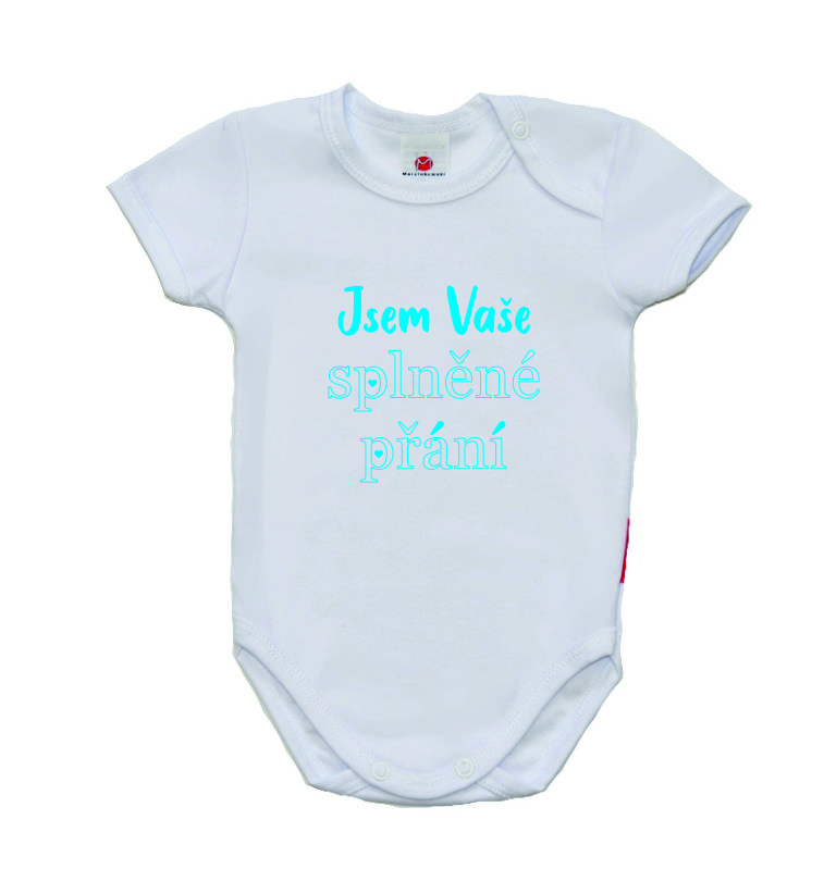 Vtipné body pro miminko s českým potiskem, Jsem Vaše splněné přání, je nádherné, velmi kvalitní bavlněné dětské body, které je velmi příjemné na nošení s vtipným potiskem ve velkém provedení.