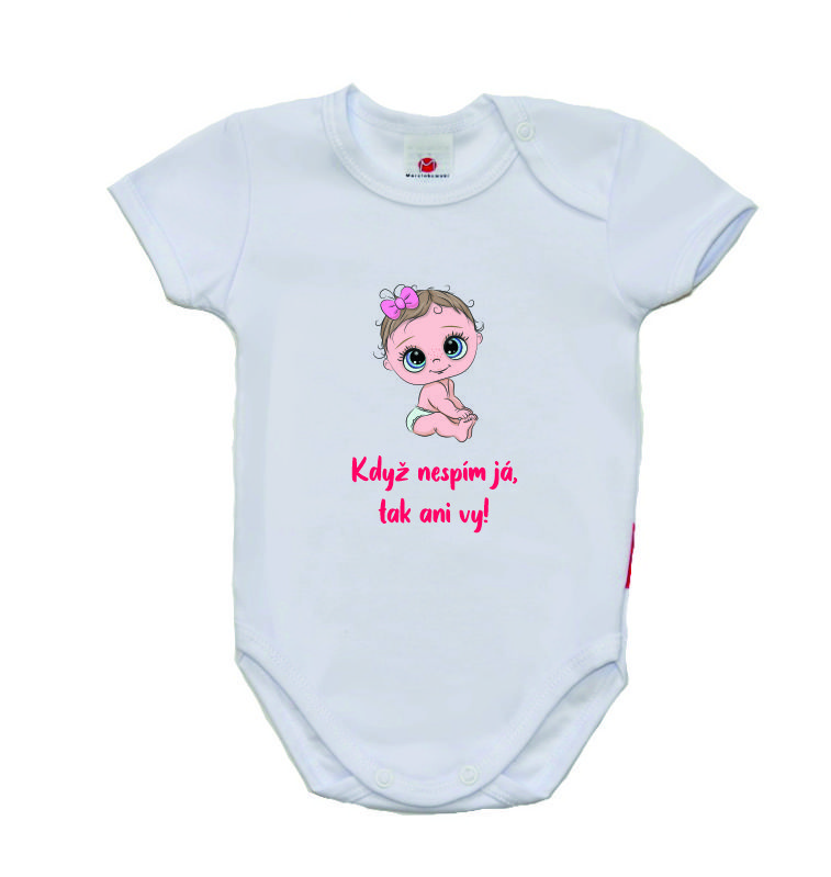 Vtipné body pro miminko s českým potiskem, Když nespím já, tak ani vy! pro holčičku, je nádherné, velmi kvalitní bavlněné dětské body, které je velmi příjemné na nošení s vtipným potiskem ve velkém provedení.