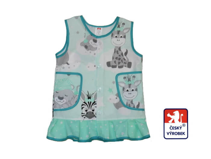 Dívčí zástěrka do školky Dětský svět, zelená zebra s kamarády, je výrobek z naší vlastní výroby Dětský svět Fulnek